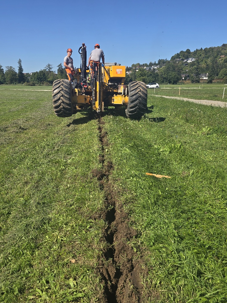 Im September 2025 konnten wir ein anspruchsvolles Vorhaben für die IWB Basel in der Wasserschutzzone S2a, realisieren. Die bestehende alte Gussleitung wurde durch uns mit modernster Technik erneuert. Im Einsatz standen der Kabelpflug KPZ160 und die Zugmaschine Class Xerion, um eine neue Gussleitung FZM NW100 sowie ein PES63-Druckrohr in einer Länge von 203 Metern sicher einzuziehen – an nur einem Tag.