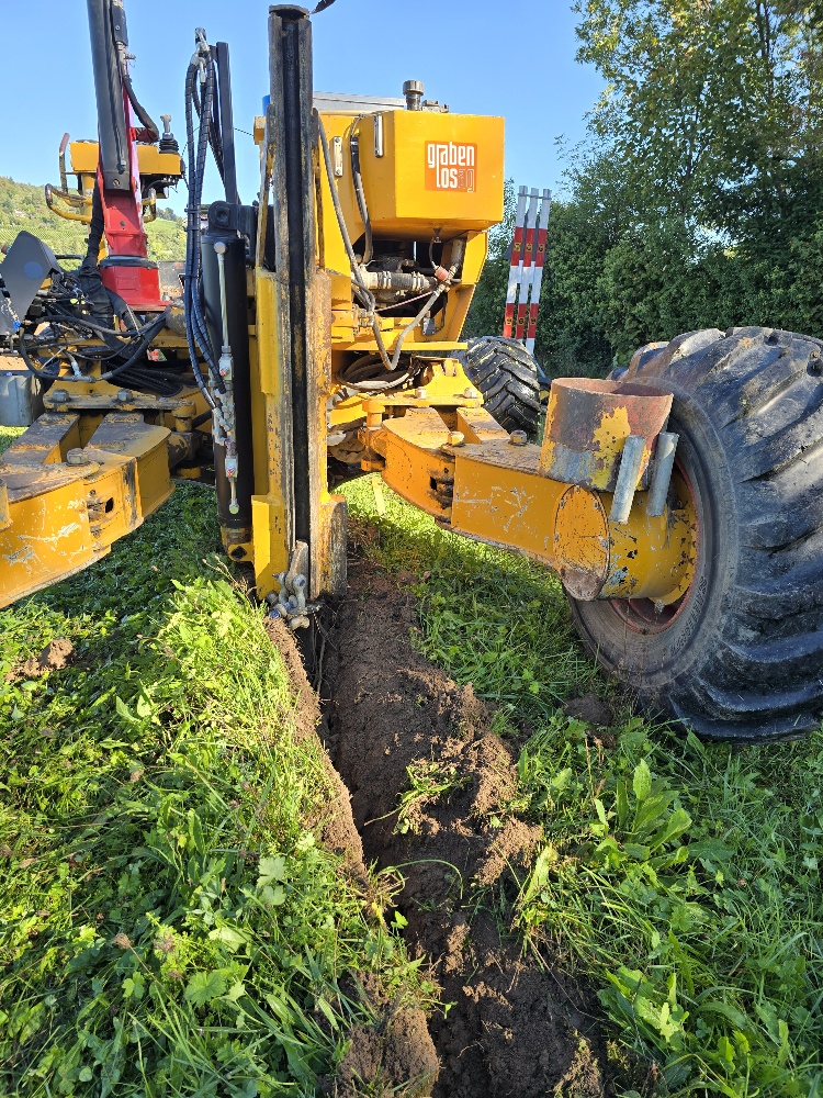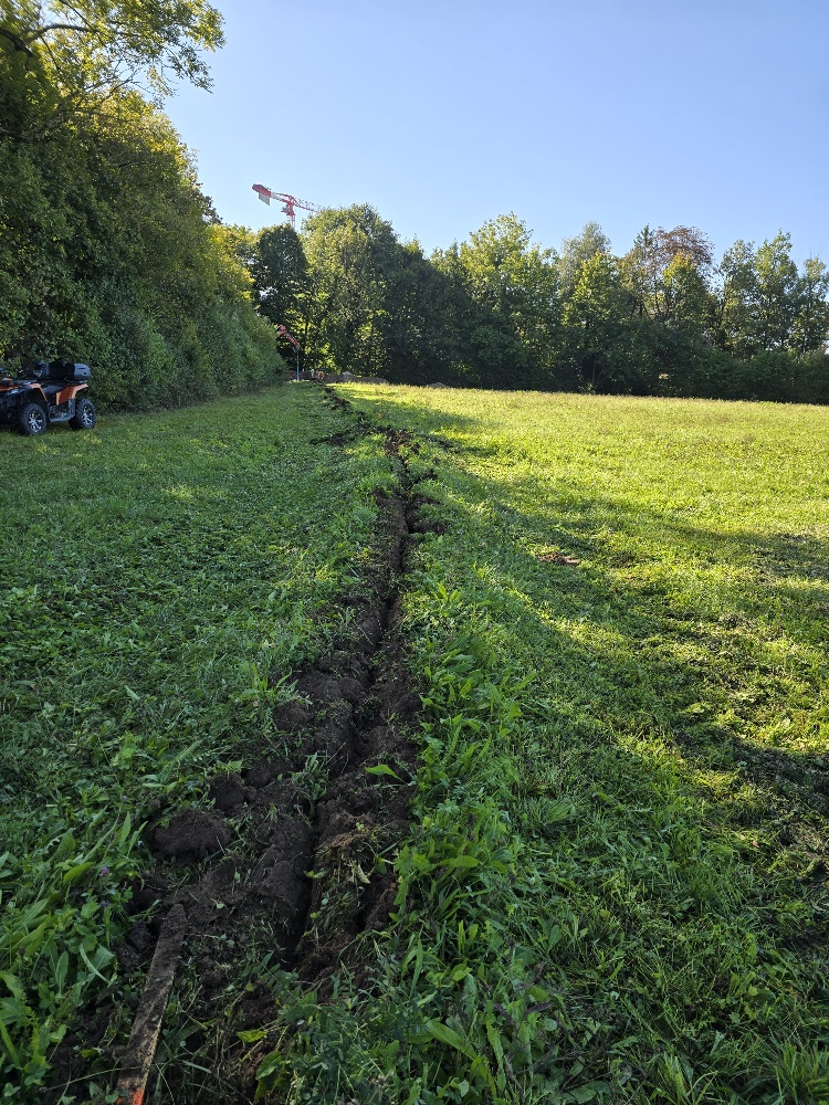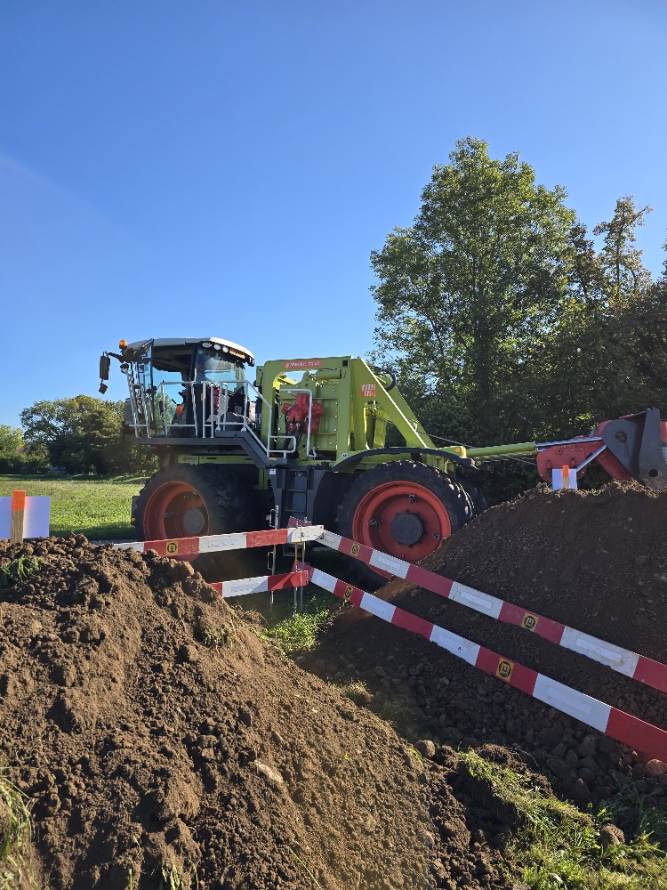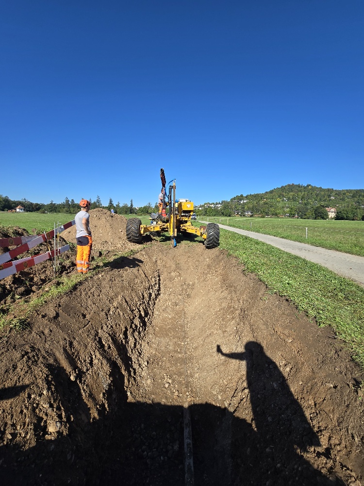Im September 2025 konnten wir ein anspruchsvolles Vorhaben für die IWB Basel in der Wasserschutzzone S2a, realisieren. Die bestehende alte Gussleitung wurde durch uns mit modernster Technik erneuert. Im Einsatz standen der Kabelpflug KPZ160 und die Zugmaschine Class Xerion, um eine neue Gussleitung FZM NW100 sowie ein PES63-Druckrohr in einer Länge von 203 Metern sicher einzuziehen – an nur einem Tag.