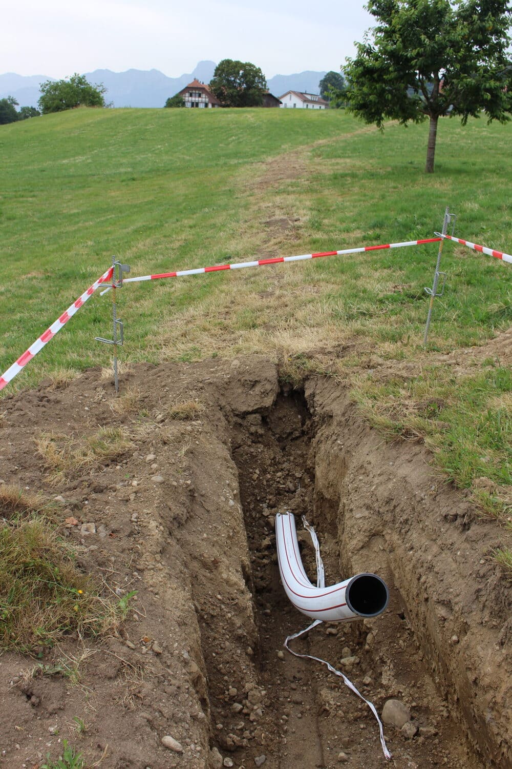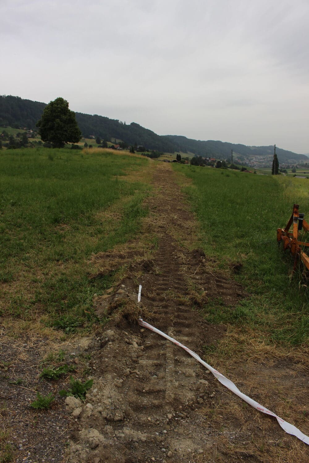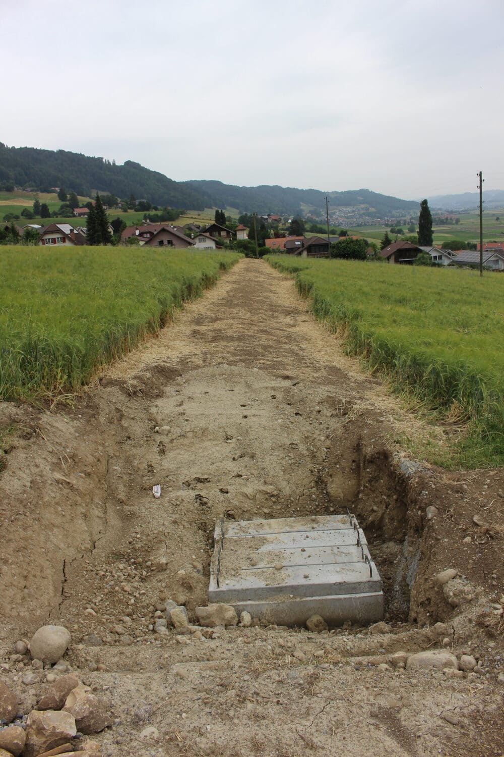 Die Leitung verläuft durch diverse Grundstücke wie Weiden, Getreide- und Maisfelder.