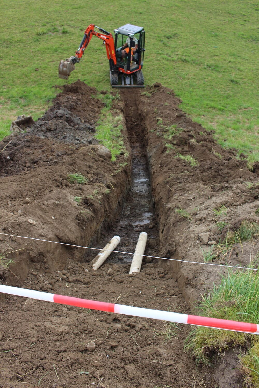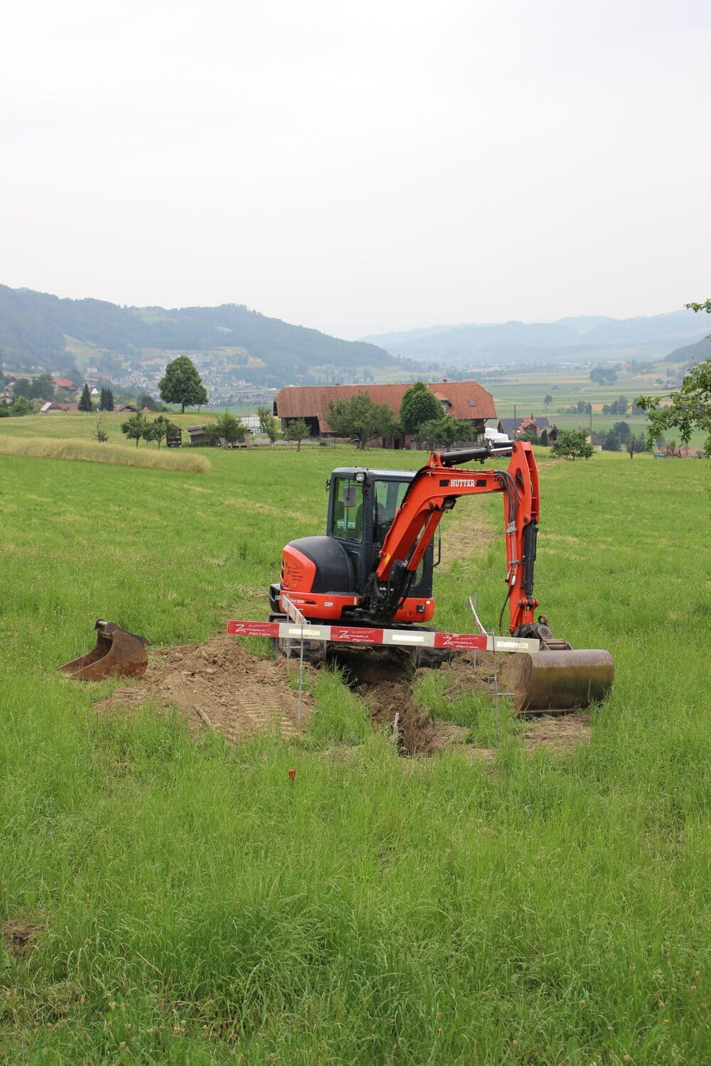 In Kaufdorf Richtung Kirchenthurnen, wird für die BKW Energie AG, 2700 Meter Stromleitung mittels Einpflügen, Spülbohren und Graben maschinell in den Boden verlegt. Zusätzlich werden Schächte und TS-Verbindungen gebaut.